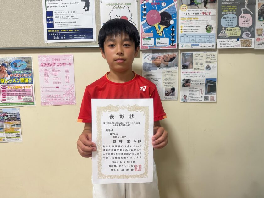 1月18日(日)佐世保市体育文化館にて、佐世保市と近隣のジュニアバドミントンクラブに所属する小学生の大会が開催され、スポしか会員「鹿町ジュニアバドミントンクラブ」のメンバー7名が参加し、優秀な成績を挙げました! 結果は以…